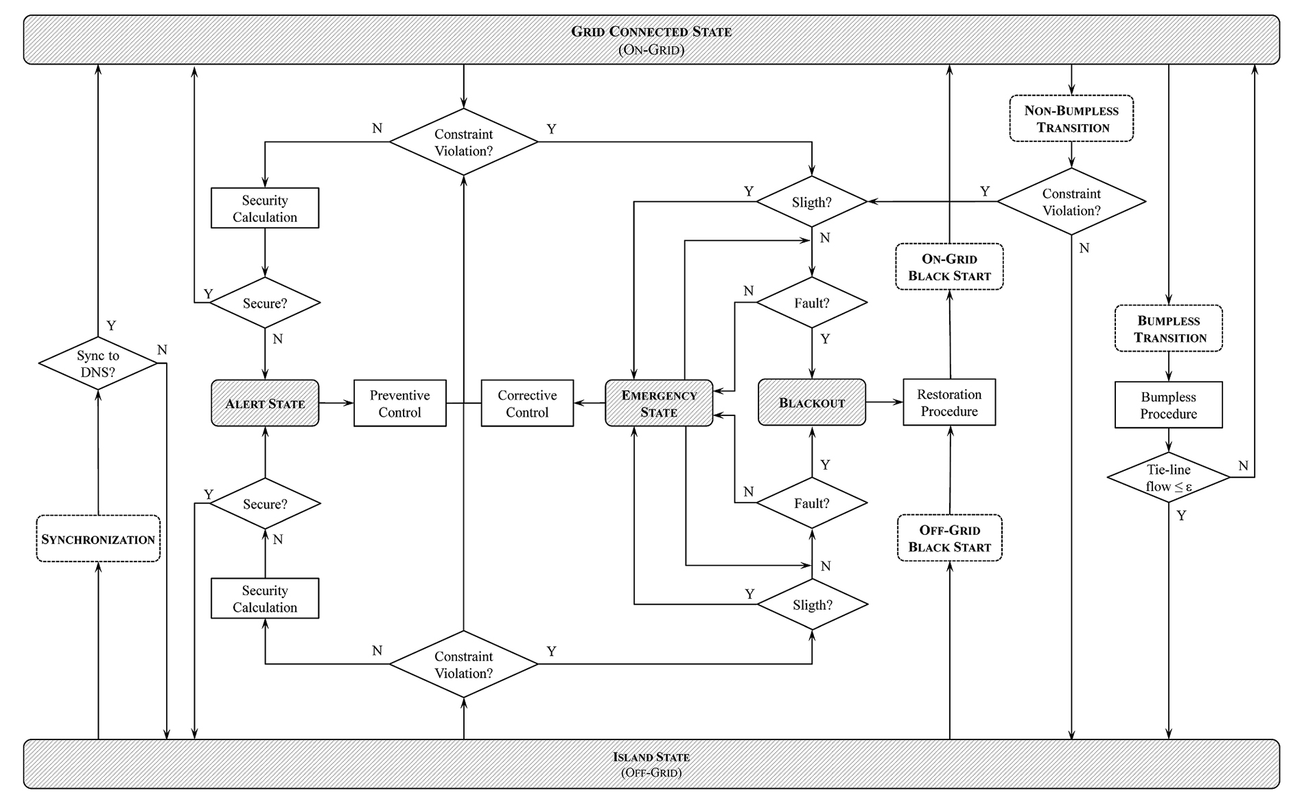 - Possible operating states and transitions of the PriceLab Microgrid